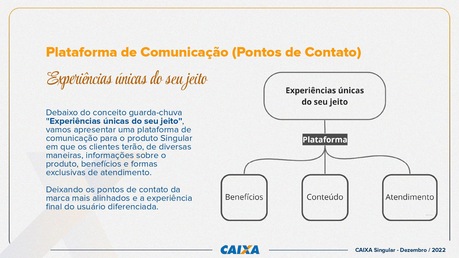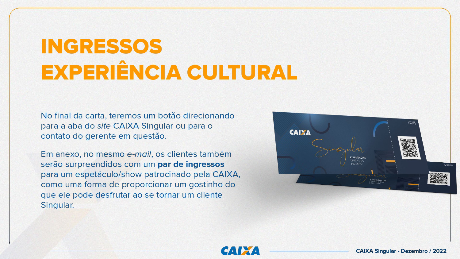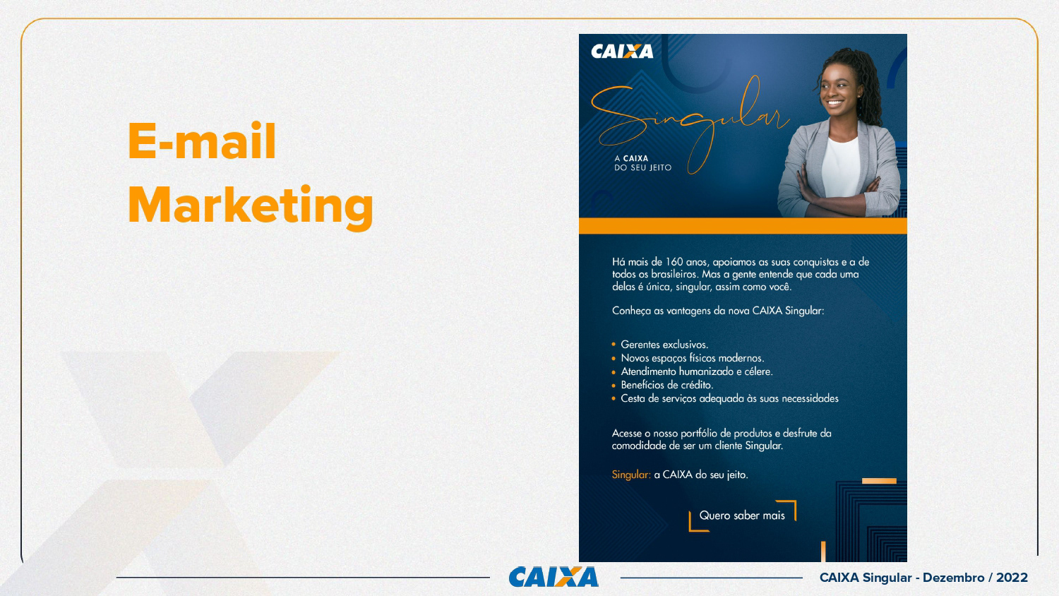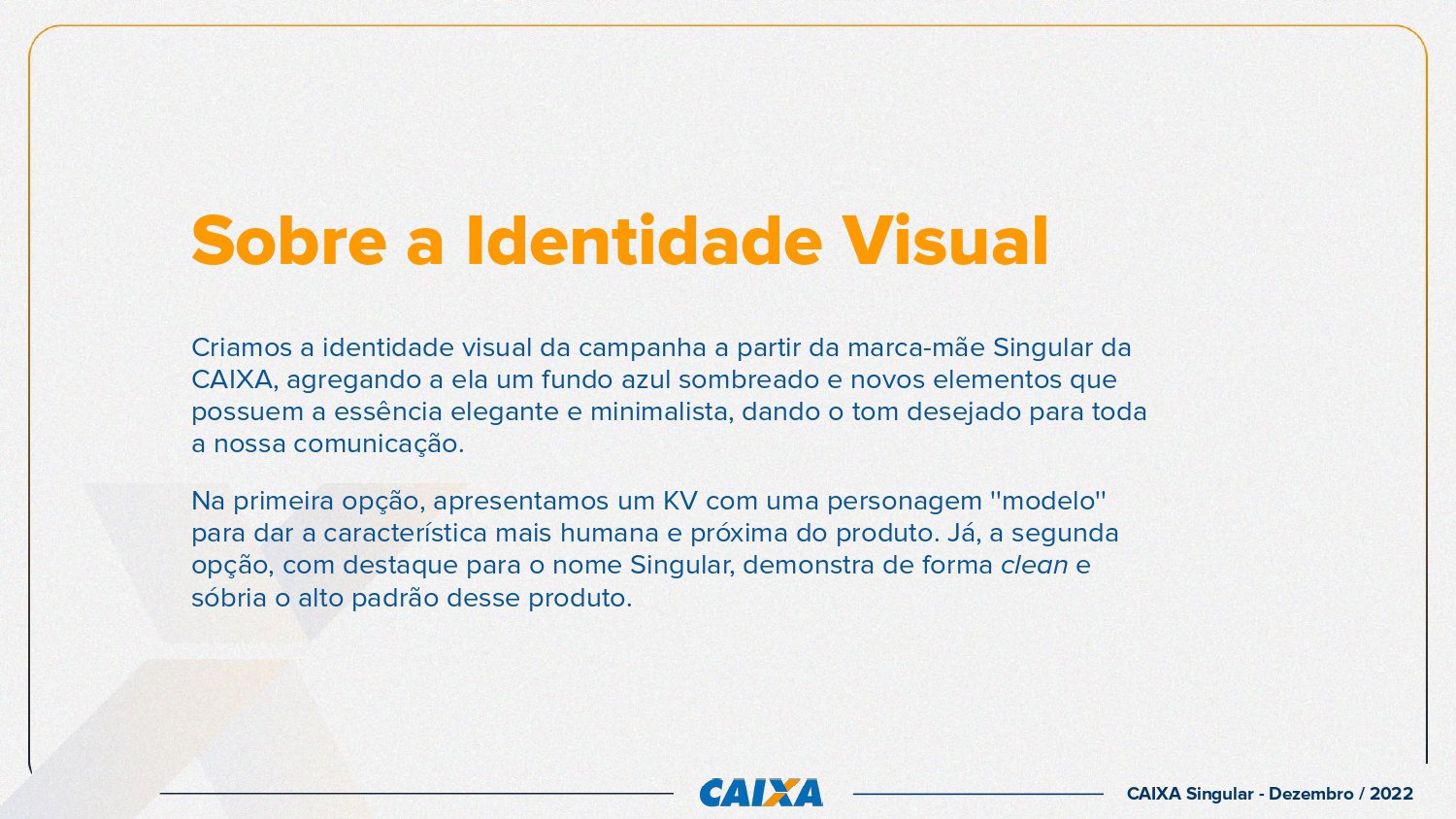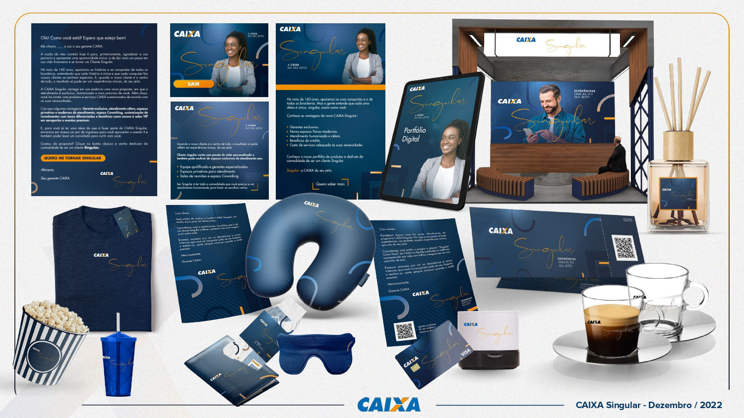 Criação de campanha publicitária e também ações de comunicação-relacionamento para o segmento Alta Renda CAIXA Singular. Job concorrência interna entre agências sendo esta abaixo a proposta vencedora.