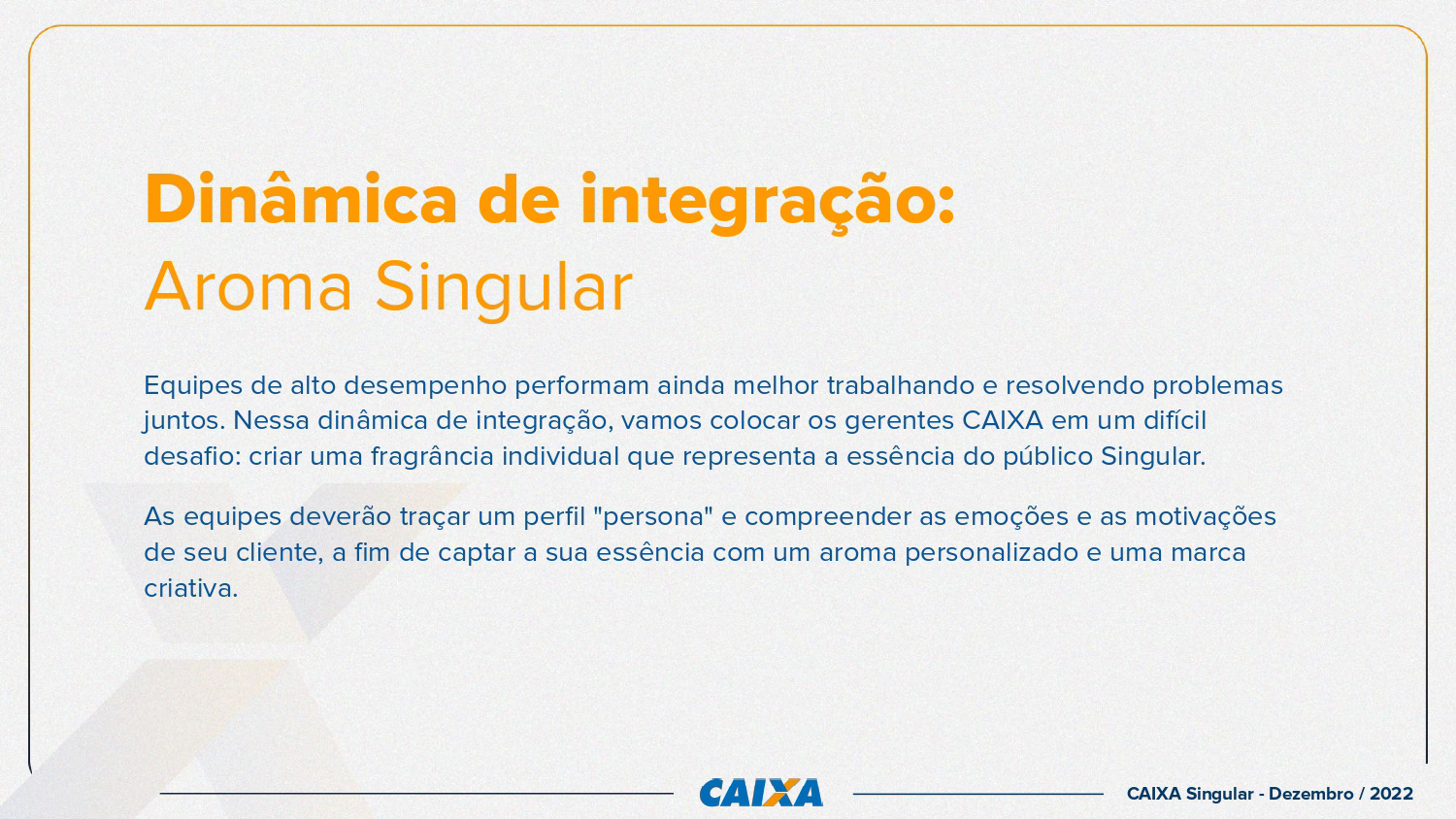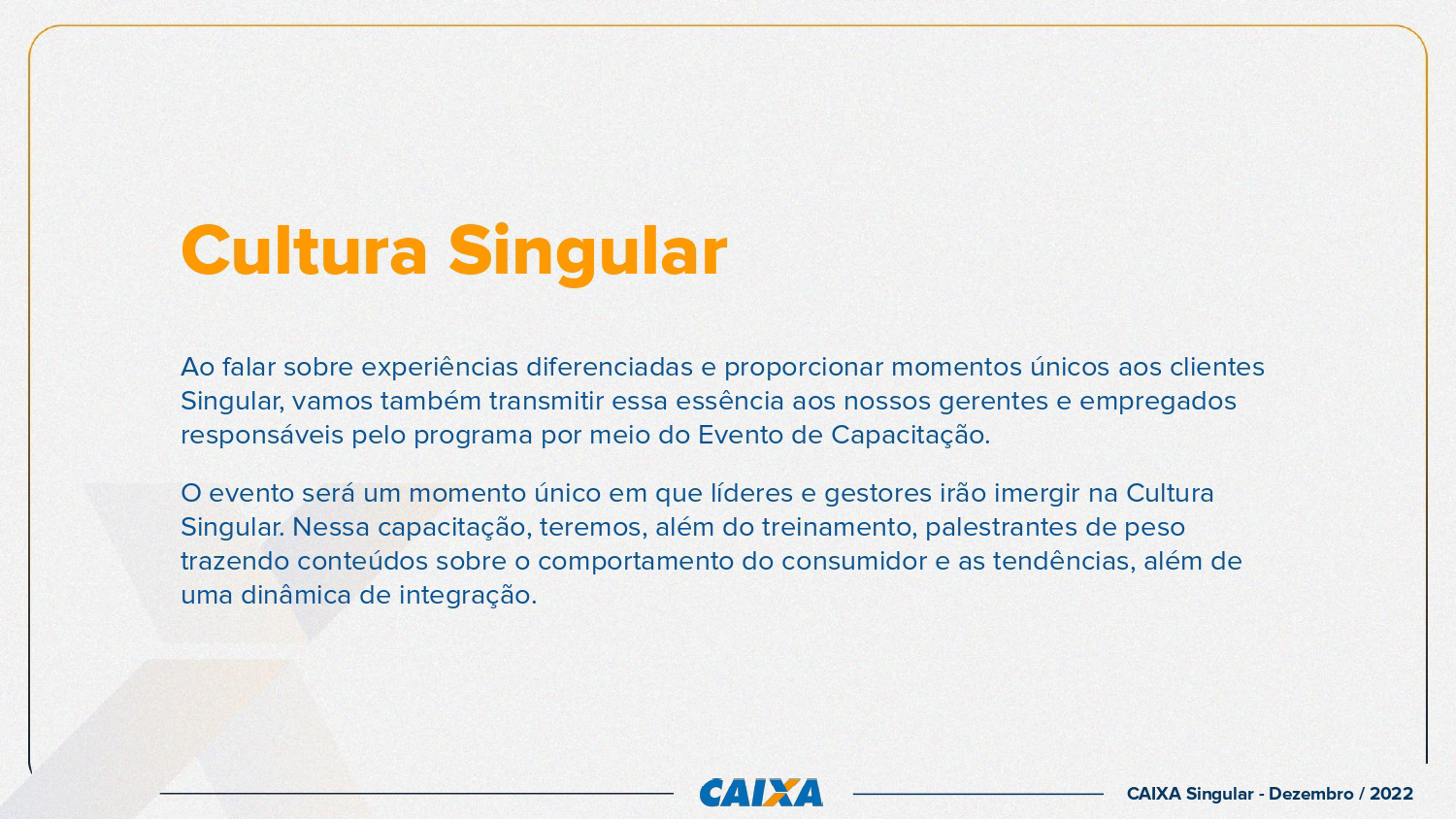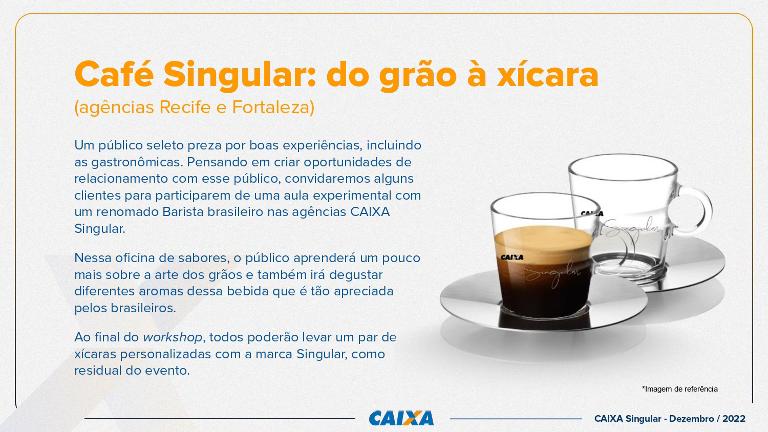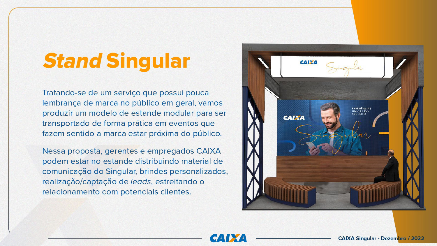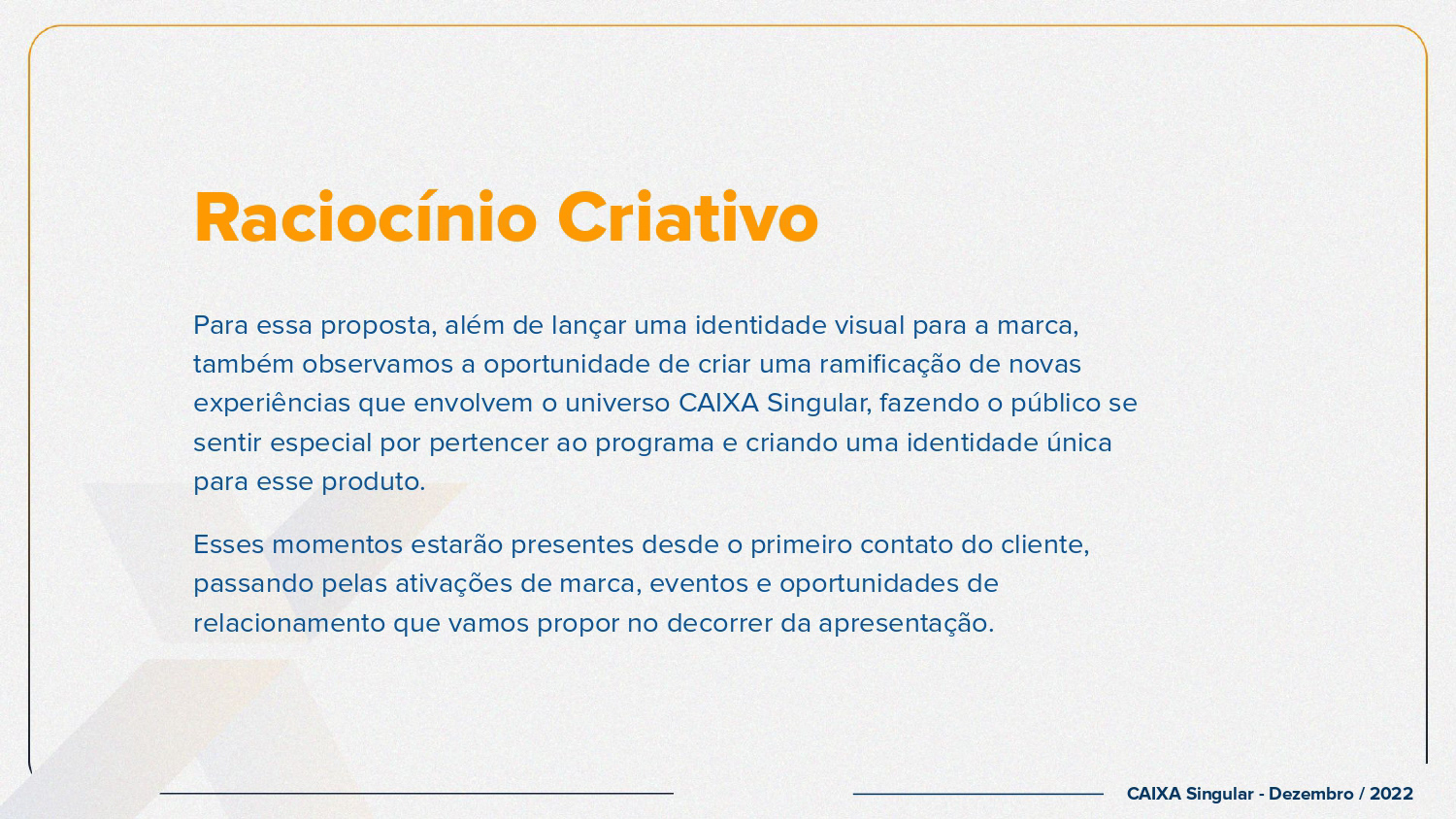 Criação de campanha publicitária e também ações de comunicação-relacionamento para o segmento Alta Renda CAIXA Singular. Job concorrência interna entre agências sendo esta abaixo a proposta vencedora.