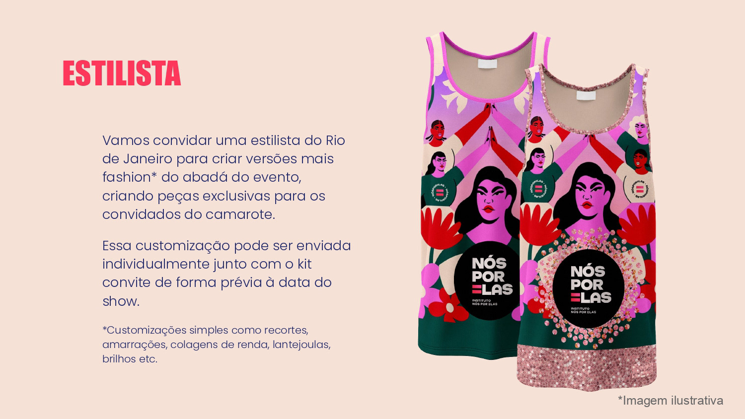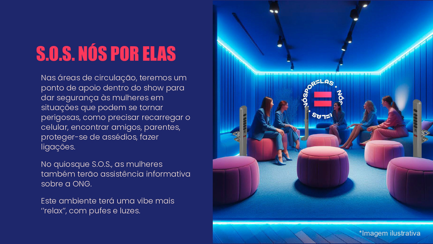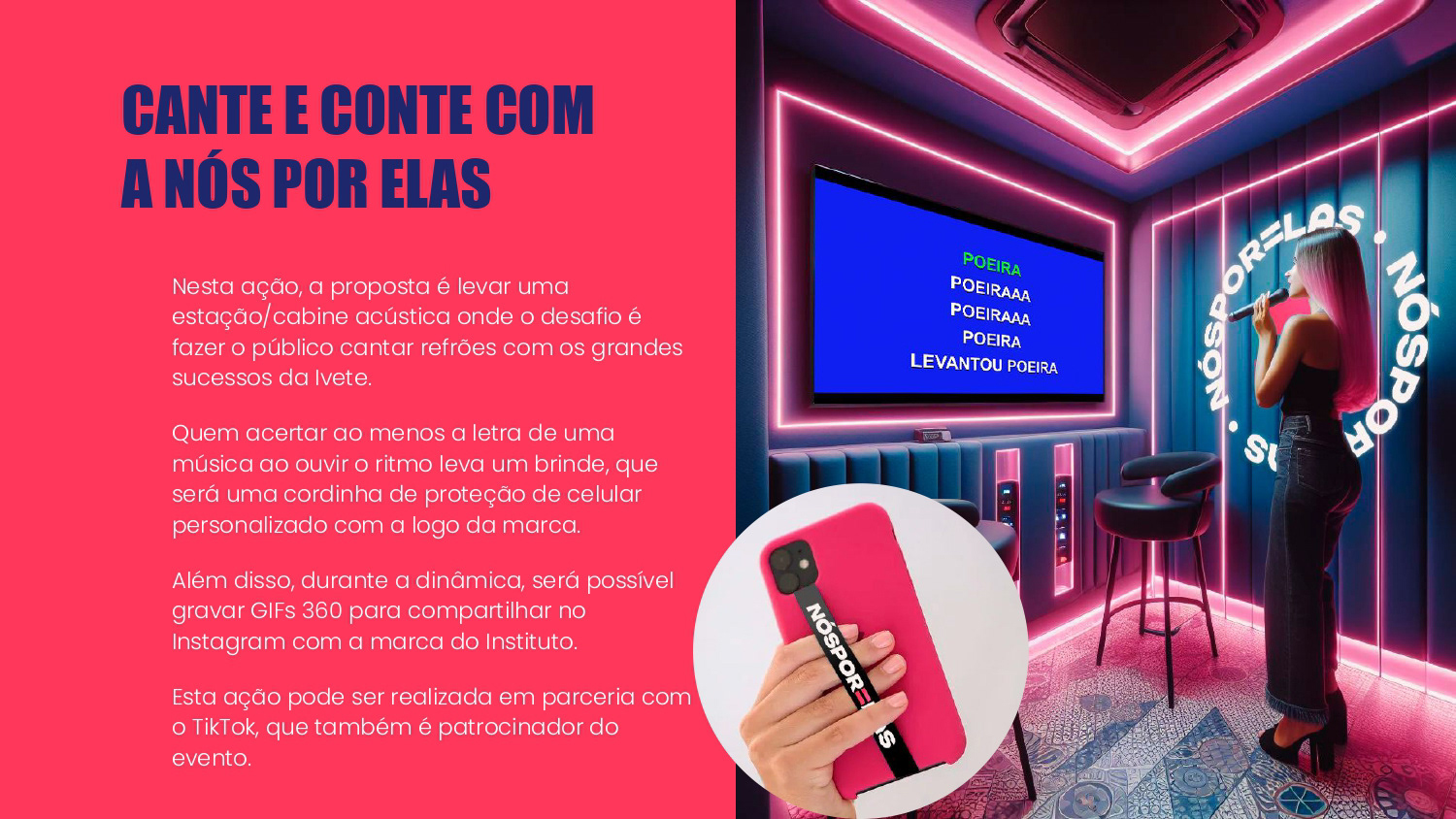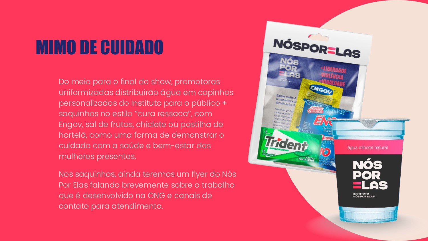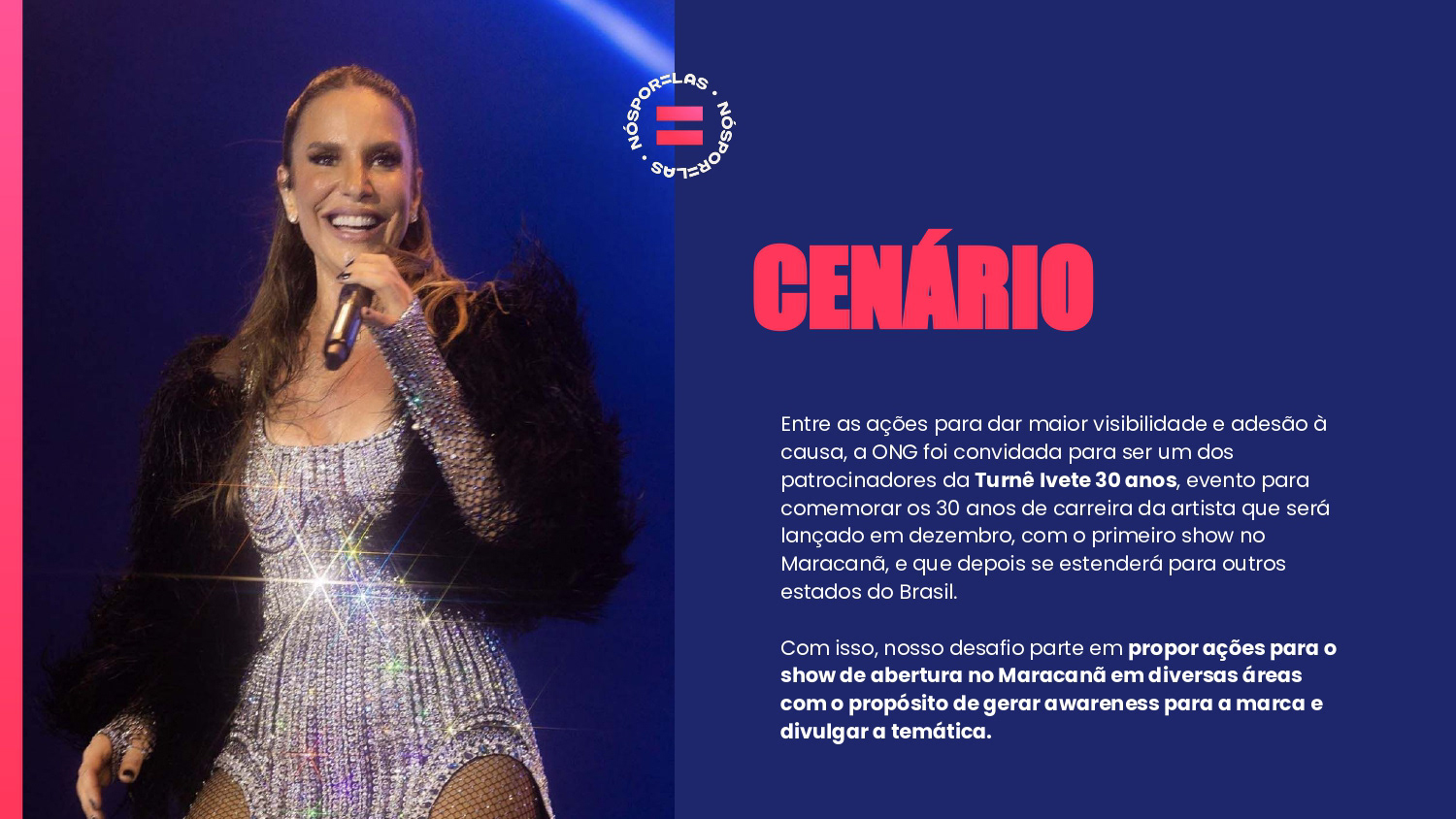 Proposta de ações de Brand Experience para a ONG Nós Por Elas no show de turnê Ivete 3.0. O propósito do projeto foi gerar awareness para a marca e divulgar a causa de apoio às mulheres no evento.